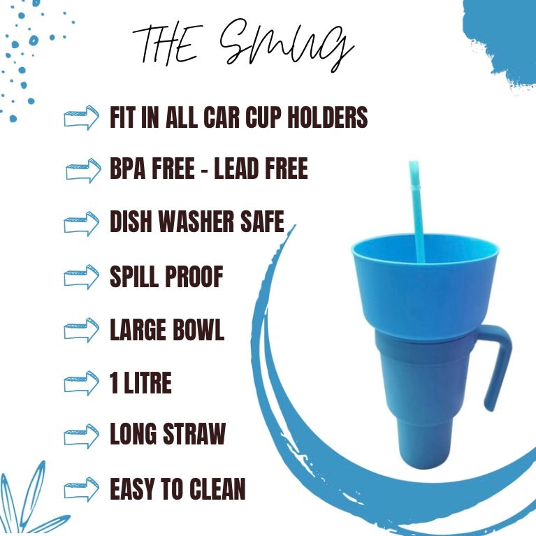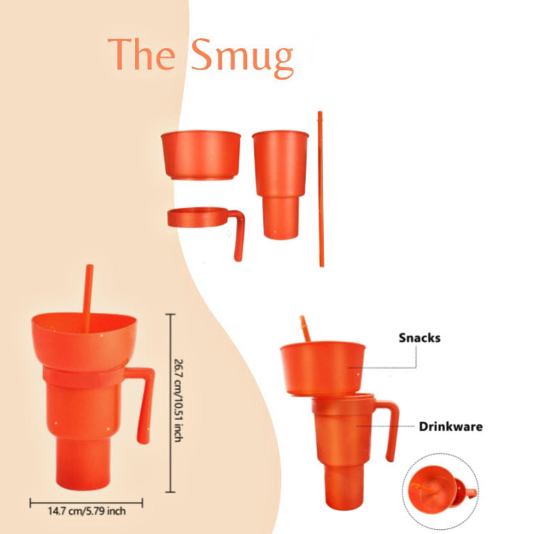 Introducing Smug - the perfect mug for all your snacking and drinking needs! With a built-in straw and connected bowl, you can enjoy both your favorite snacks and cold drinks simultaneously. No more juggling multiple containers or spills. Get your Smug today and make snacking a breeze!